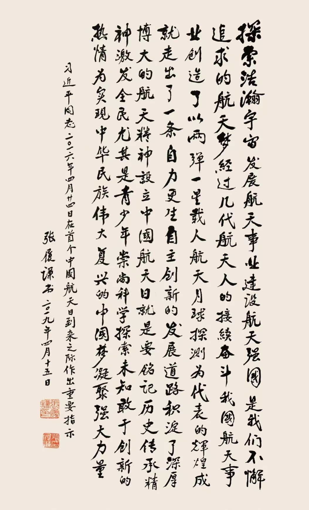 张履谦院士是我国雷达、电子对抗和航天技术领域的著名专家,中国工程院院士,是我国航天事业发展的亲历者见证人。本次书法展分为“领导指示”“航天精神”“对青少年的鼓舞”“诗词格言”等四个专题,共展出张履谦院士书法作品百余幅作品。