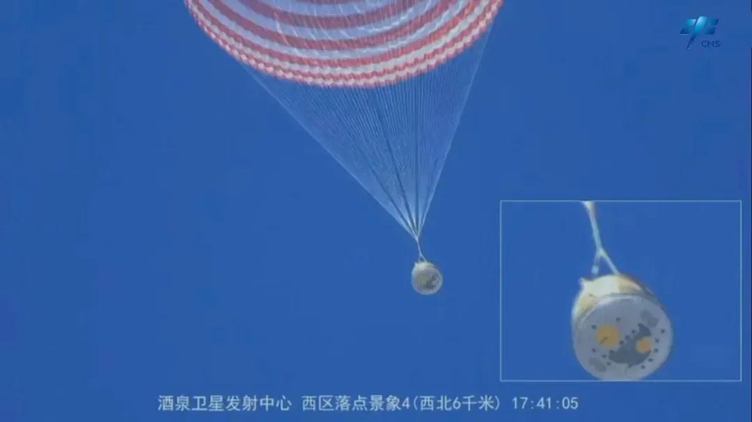 北京时间2024年4月30日17时46分,神舟十七号载人飞船返回舱在东风着陆场成功着陆,现场医监医保人员确认航天员汤洪波、唐胜杰、江新林身体状态良好,神舟十七号载人飞行任务取得圆满成功。