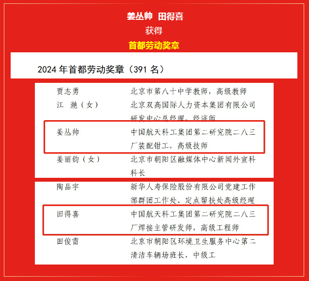 近日,北京市总工会、北京市人力资源和社会保障局授予76个单位“首都劳动奖状”称号,授予391名同志“首都劳动奖章”称号,授予148个班组(团队)“北京市工人先锋号”称号。二院2人获得“首都劳动奖章”。