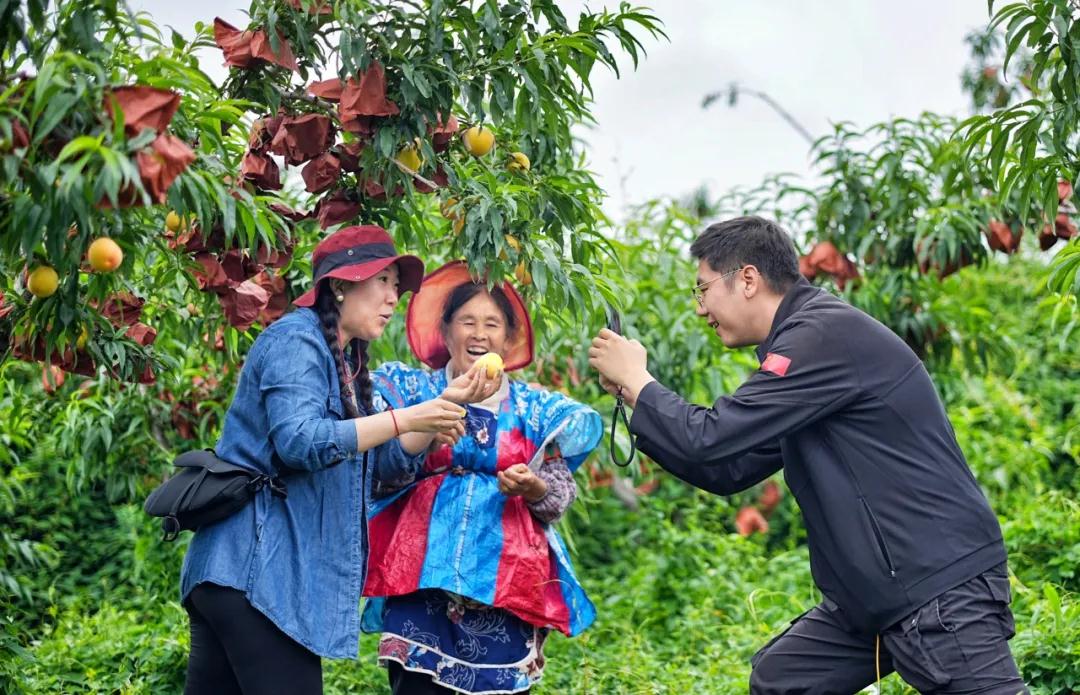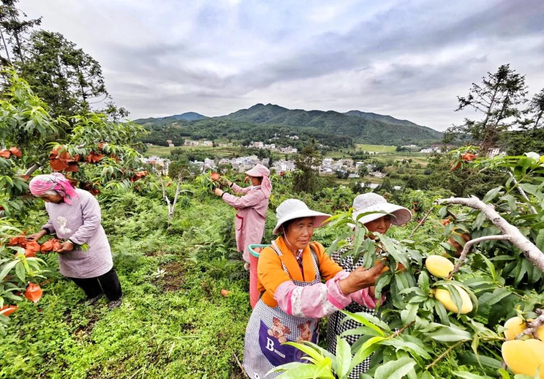 上了桃山,摘桃的多是上了年纪的女工,她们身形小巧,背着竹筐,游走于山上的一株株桃树间,凭借经验摘下成熟度适宜的黄桃……
