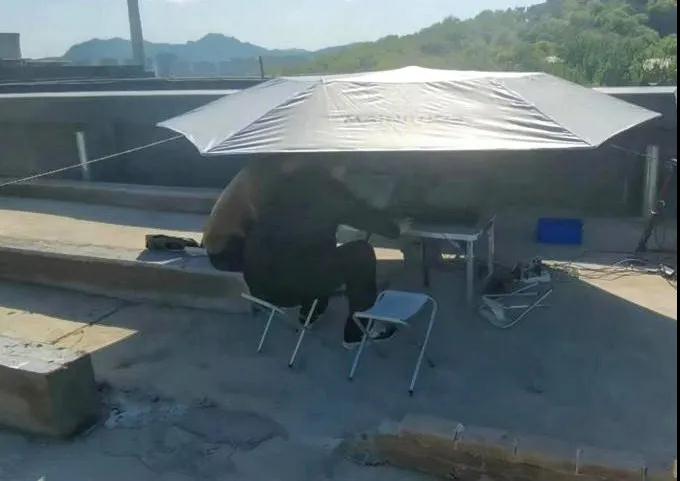 由突击队承担的驱鸟研发项目需要常驻试验现场采集数据,为了对样机性能进行测试验证,确保实时掌握最新数据,队员小于、小史和小张等人顶着烈日将沉重的样机设备搬运至高塔上安装,在天台就地支起了简易办公桌。一桌两椅,成为了大家的“露天办公室”。