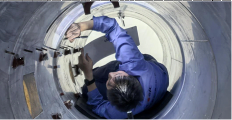 试验件中有一个空心圆柱结构,需要人钻进筒内进行检测。小刘就是啃这块“硬骨头”的“钻筒人”。他双腿跪在地上,弯下腰钻进圆柱形的产品中,狭窄的空间使得他每向前挪动一步都十分的艰难。爬到目标位置后,小刘翻过身,四脚朝天,对产品进行测量和标记,再把胶片固定到指定位置。因为试验精度要求高,为避免舱体晃动过大造成胶片位置偏差,继而影响射线探伤质量,小刘屏住呼吸,轻手轻脚地做每一个动作。就这样,每透照一张,小刘就爬进爬出一次,为了完成试验,一件产品小刘进进出出了五十余次。