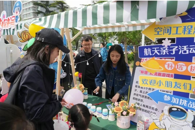 课程结束后,小朋友们在家长的带领下走进“春日航天畅游集市”,在游戏中了解导弹设计、运输、发射、命中的各个过程,既学习了导弹的知识,也体验了竞技的乐趣。通过重重关卡,收集航天纪念章,获得航天文创奖品,再将满载航天精神卡片埋入花盆,航天精神的种子就这样在每一个航天职工家庭中生根发芽。