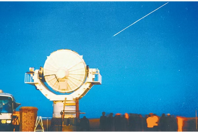 史总珍藏着一张照片:一部雷达仿若一只大眼睛,正“注视”着暗蓝天空上划过的白色“流星”——那不是流星,而是神舟五号,舱内航天员正是“航天英雄”杨利伟。