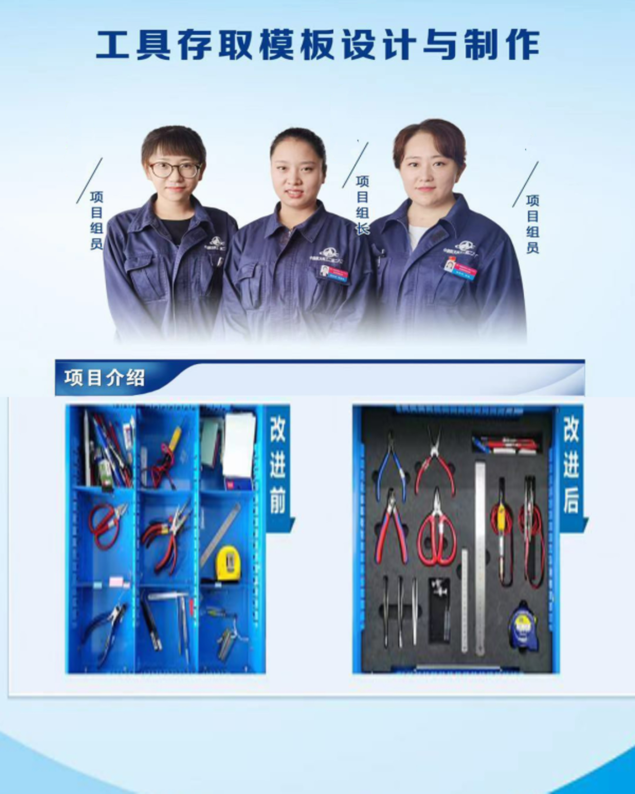 电缆制作工序繁琐,工具零件数量够多,存取不便,电装产线小分队3人组,在组长芳芳的组织下对工具存取柜进行了专门6S定制,工具使用实现了一目了然甚至可以盲存取,提升了使用效率。