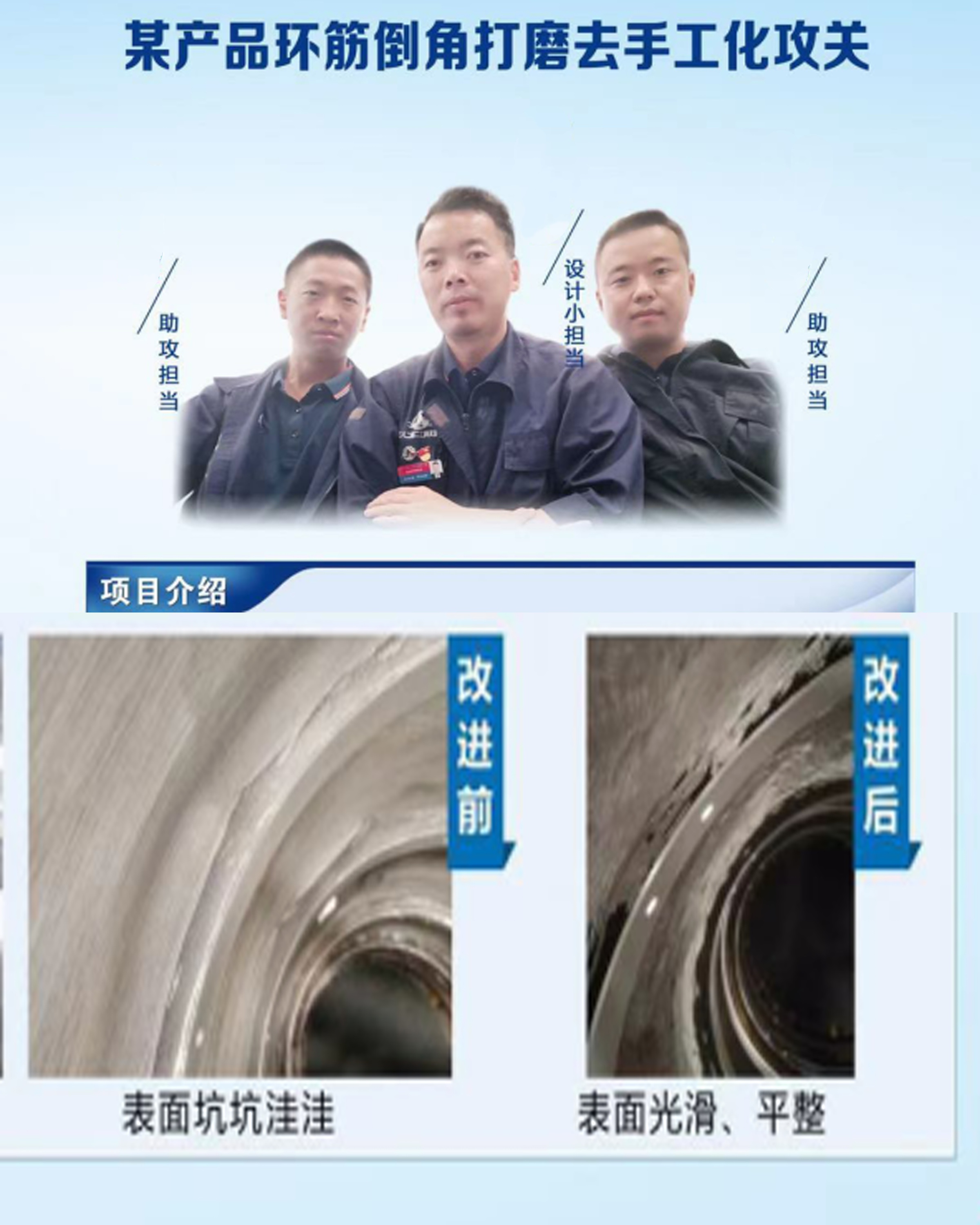 由胡师傅“领街主演”的设计小担当携两名助攻担当,采用数控编程解决了某产品内壁倒角只能依靠手工打磨的技术壁垒,解决了手工打磨劳动强度大、质量不稳定的难题,加工效率稳步提升。