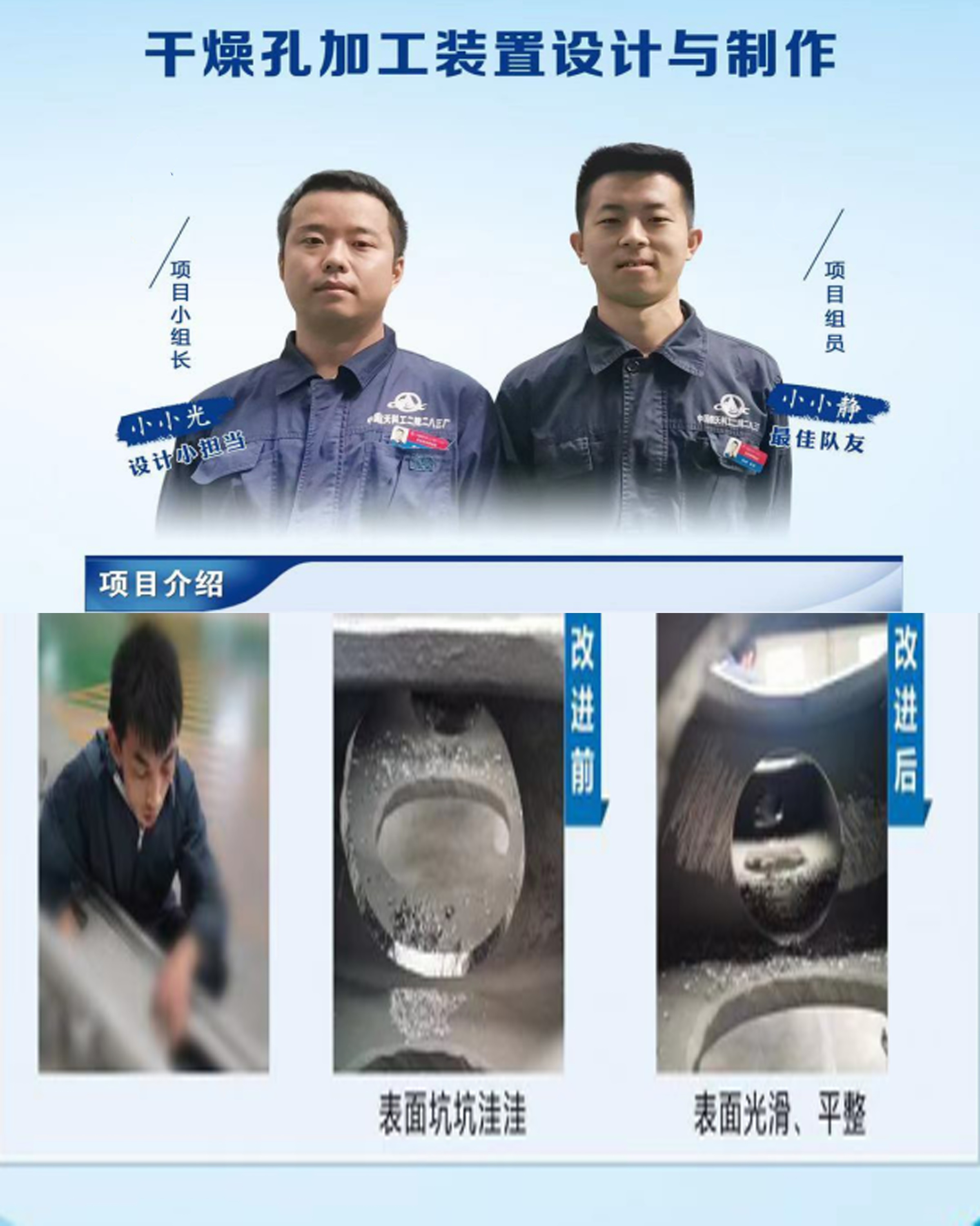 没有标准的器材,就没有标准的方圆。小小光和小小静俩人都有一个共同点,那就是追求极致,做到精益求精,干燥条件下孔加工装置的成功诞生就是他俩智慧的结晶,使用这种加工方法,他们的工作效率翻了4倍。
