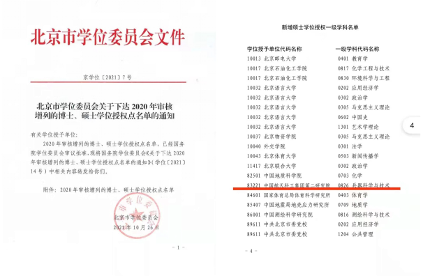 近日,北京市学位委员会公布了“2020年博士硕士学位授权审核”结果,二院成功申报新增“兵器科学与技术”一级学科硕士学位授权点。至此,二院拥有1个一级学科博士学位授权点、1个二级学科博士学位授权点、9个一级学科硕士学位授权点和1个二级学科硕士学位授权点,学科门类覆盖工学、理学。
