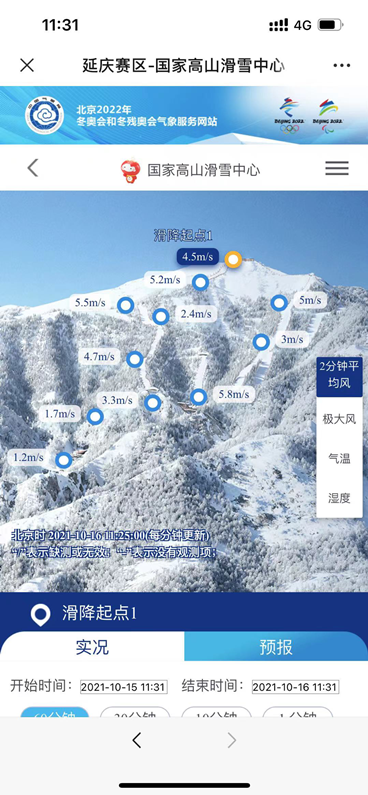在冬奥会的网站上,高山滑雪的气象信息数据每分钟更新一次,可以看到每一个滑降关键点的平均风速、最大风速、温度、湿度,这些数据来自中国航天科工二院23所航天新气象公司的自动气象站。