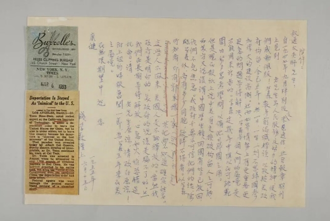1955年,钱学森夫妇巧妙躲过监视,将求援信辗转寄回国内。钱学森在信中写道:“无一日、一时、一刻不思归国,参加伟大的建设高潮”。