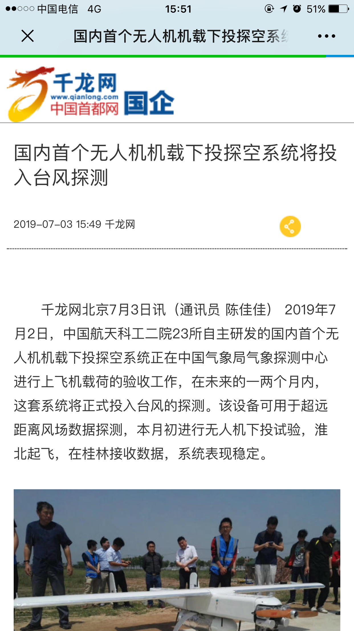 千龙网:国内首个无人机机载下投探空系统将投入台风探测