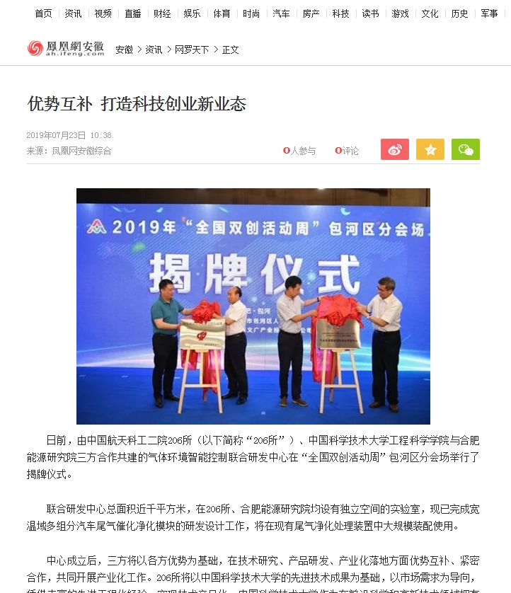 日前,由206所、中国科学技术大学工程科学学院与合肥能源研究院三方合作共建的气体环境智能控制联合研发中心在“全国双创活动周”包河区分会场举行了揭牌仪式。联合研发中心总面积近千平方米,在206所、合肥能源研究院均设有独立空间的实验室,现已完成宽温域多组分汽车尾气催化净化模块的研发设计工作,将在现有尾气净化处理装置中大规模装配使用。