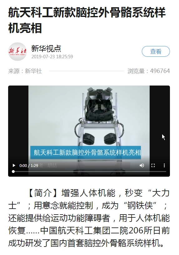 新华社:航天科工新款脑控外骨骼系统样机亮相