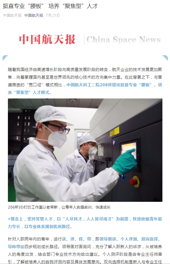 随着经济由高速增长阶段向高质量发展阶段的转变,航天企业的技术发展更加聚焦,向着掌握国内甚至是世界领先的核心技术的方向集中力量。在此背景之下,与普遍推崇的“宽口径”模式相比,中国航天科工二院206所提出挺直专业“腰板”,建设“聚焦型”人才培养模式。