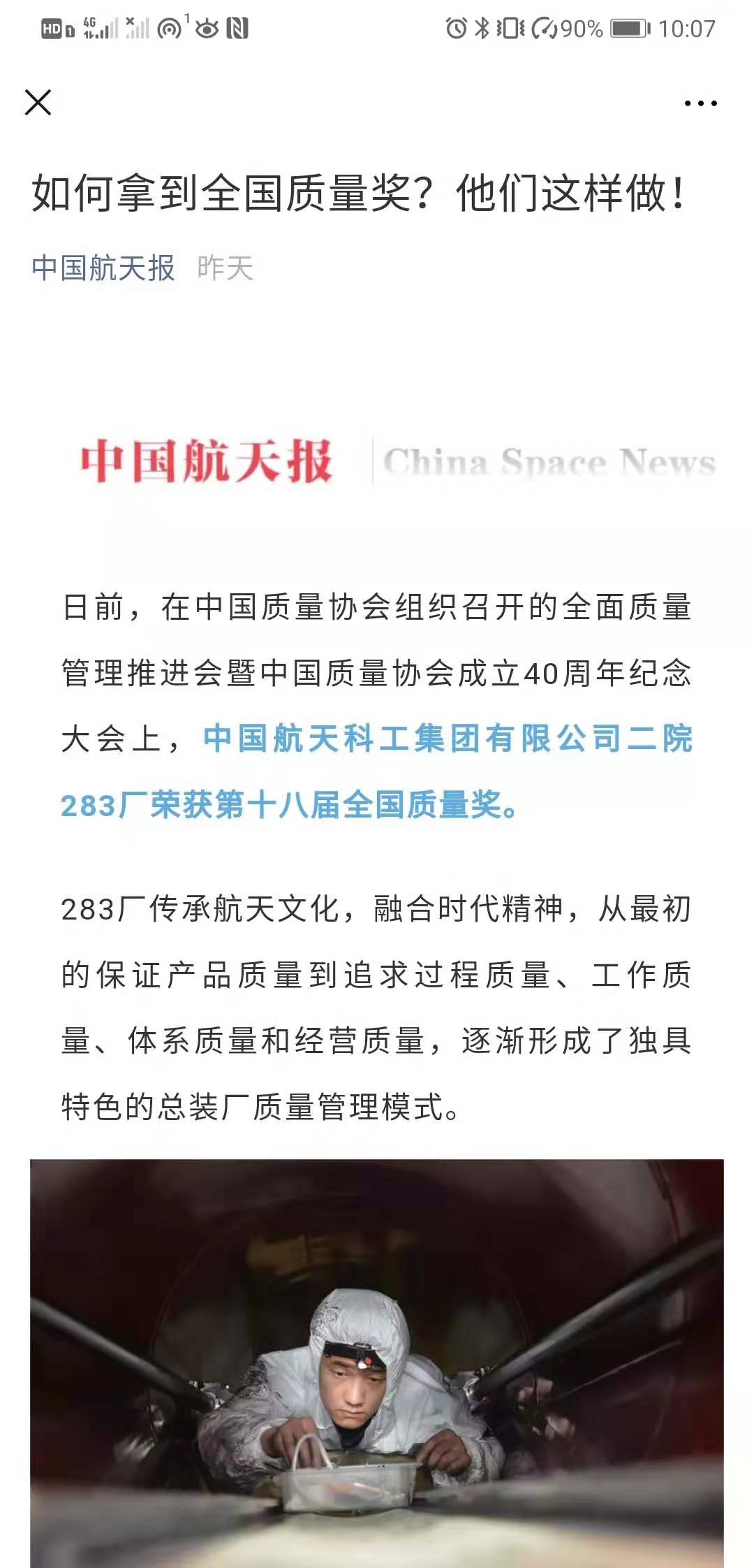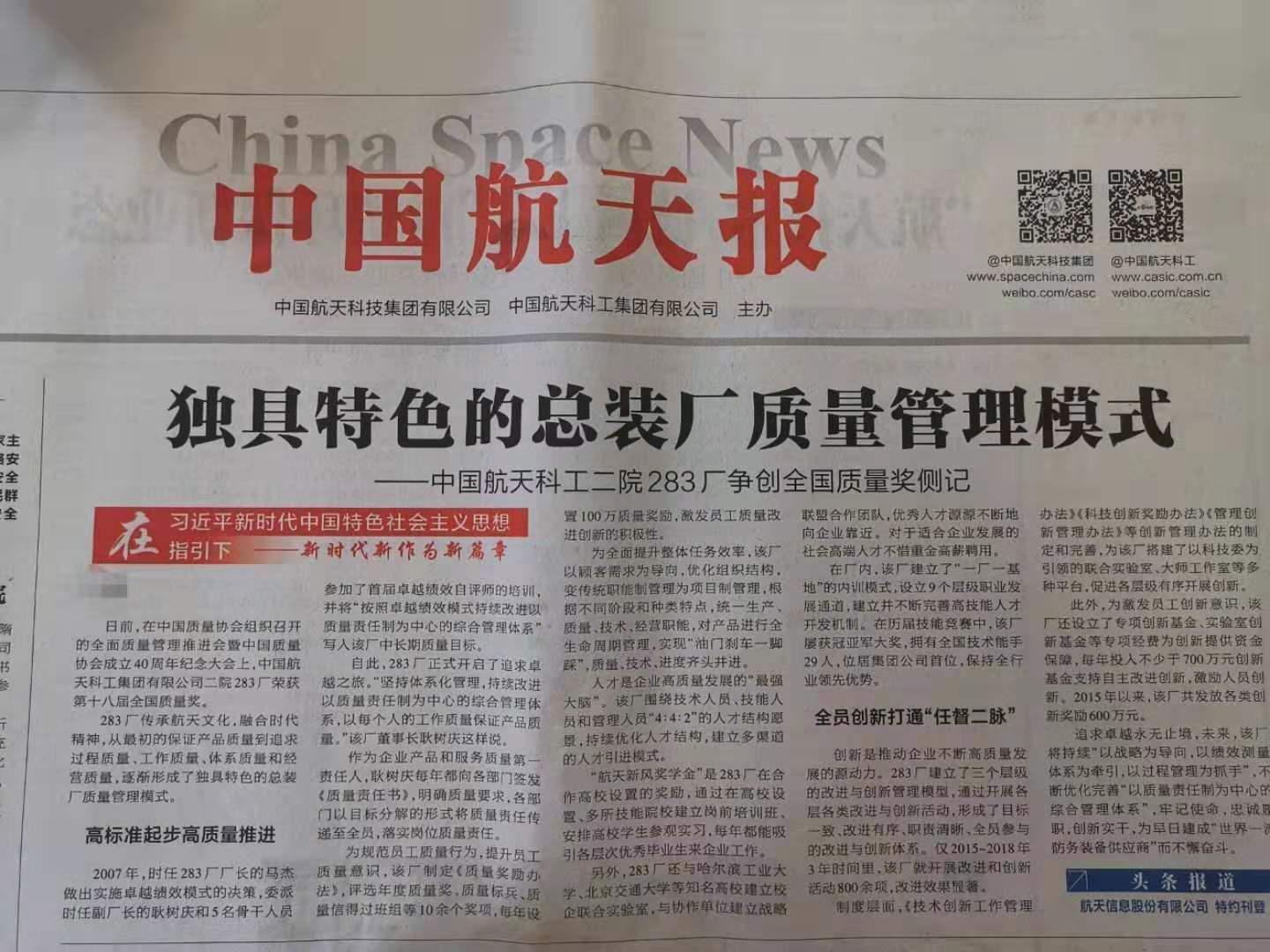 日前,在中国质量协会组织召开的全面质量管理推进会暨中国质量协会成立40周年纪念大会上,中国航天科工集团有限公司二院283厂荣获第十八届全国质量奖。