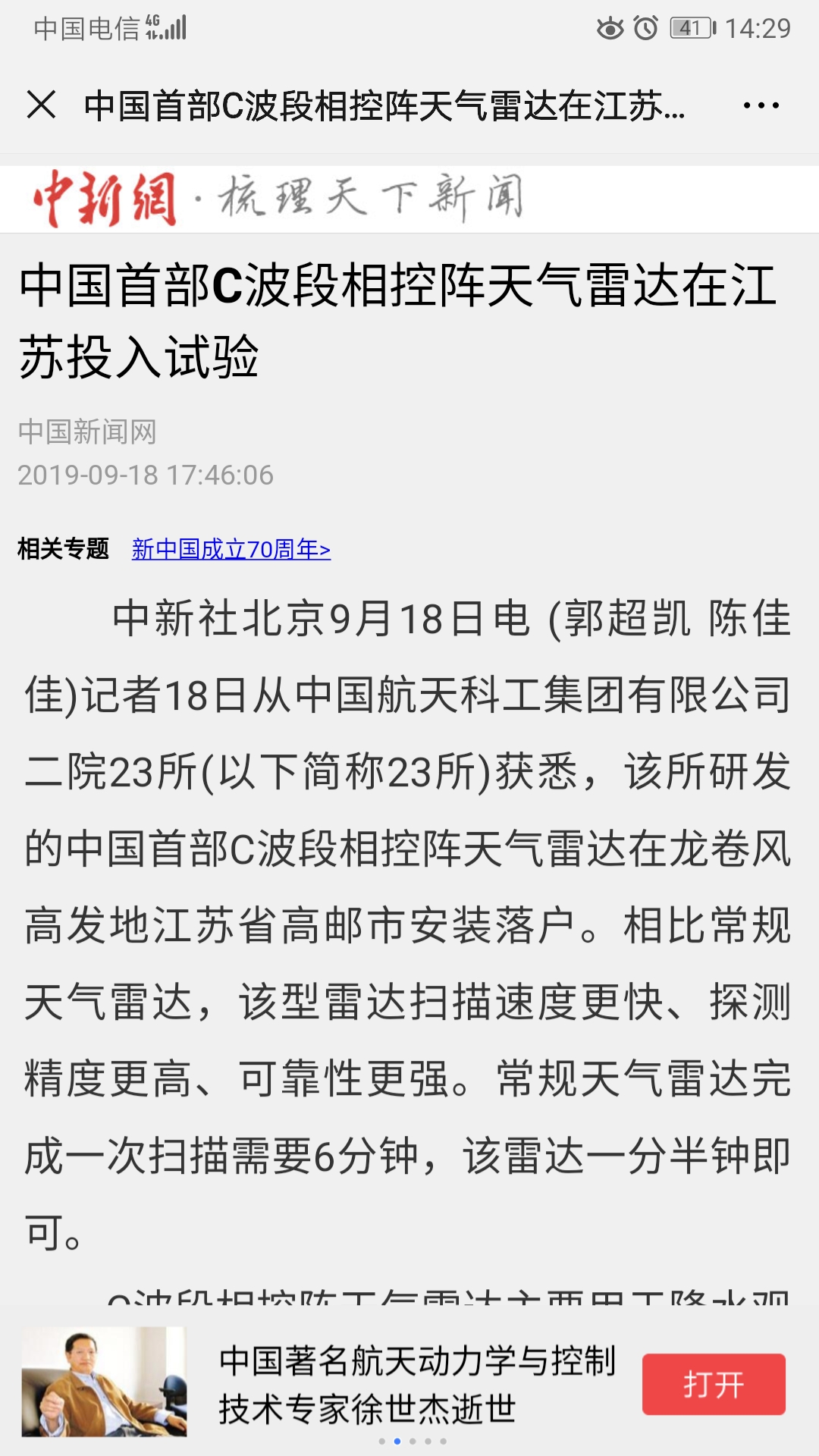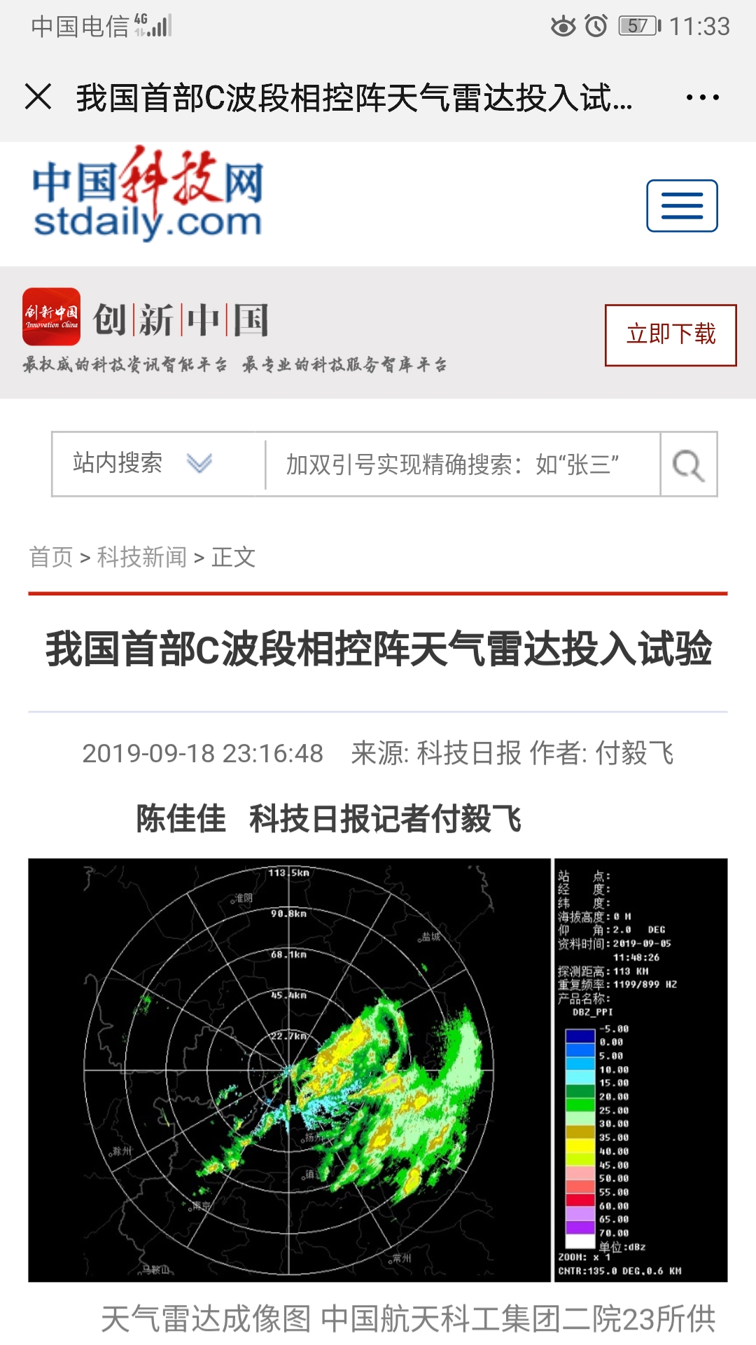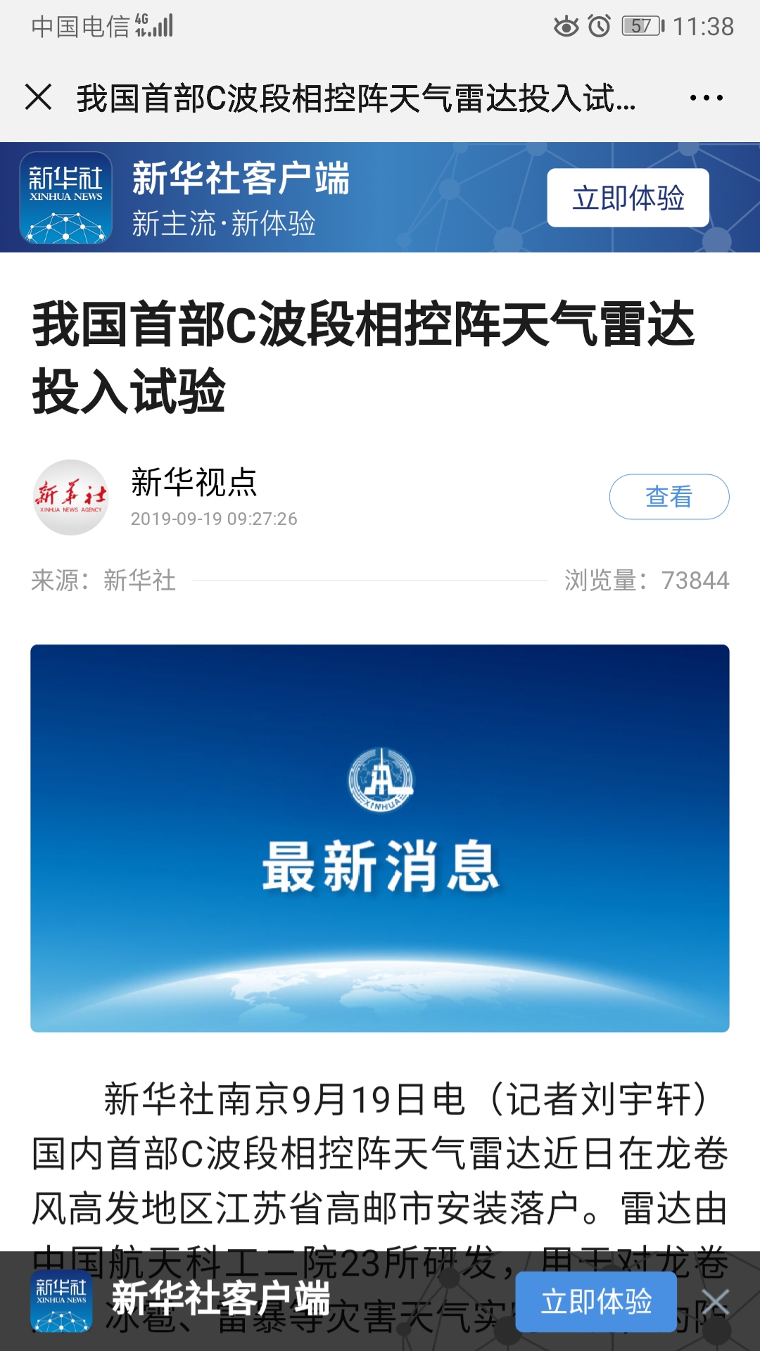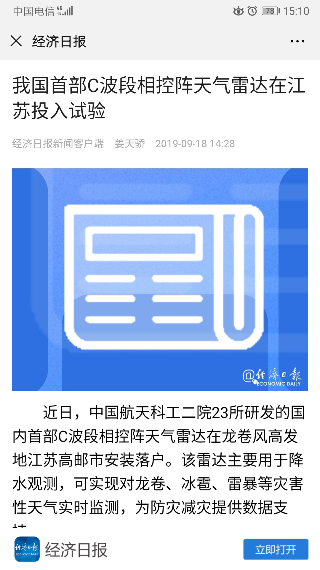 近日,新华社、科技日报、光明日报、经济日报、工人日报、中新社、中国日报、环球时报等多家中央级媒体集中报道23所研制的国内首部C波段相控阵天气雷达在江苏投入试验,引起热烈反响。