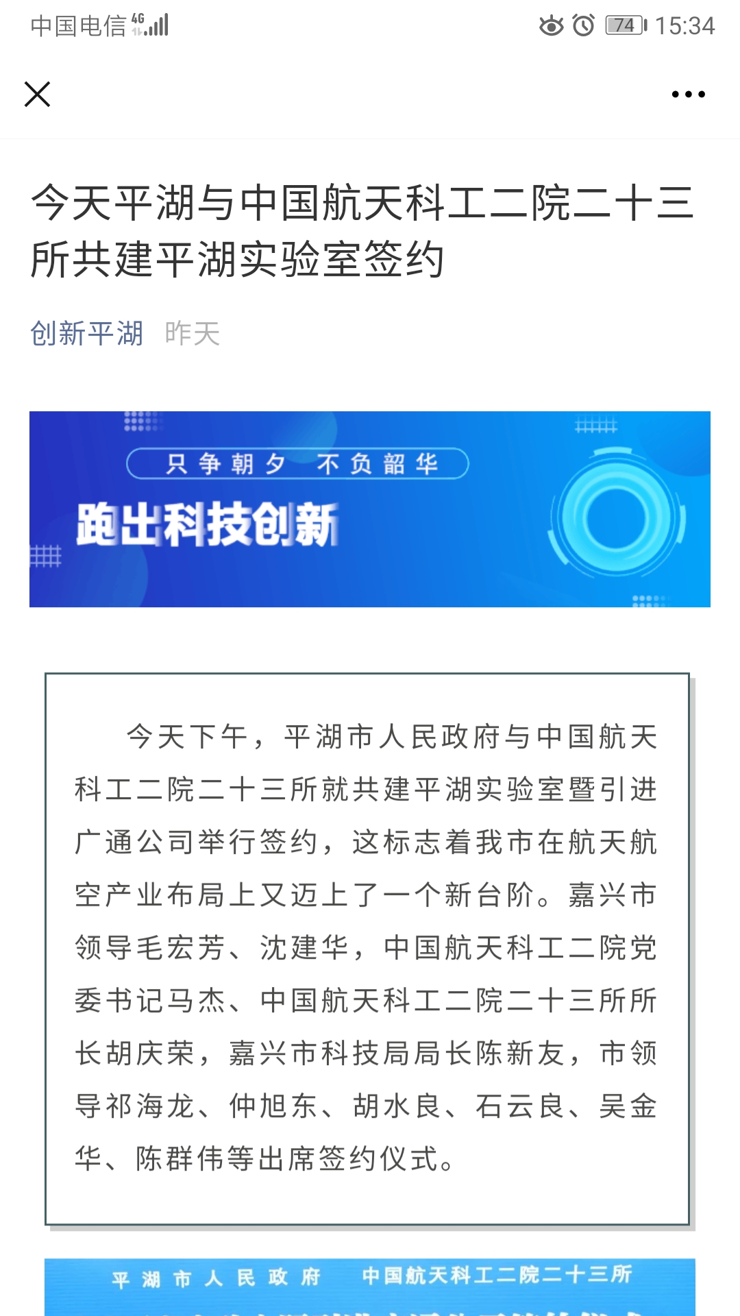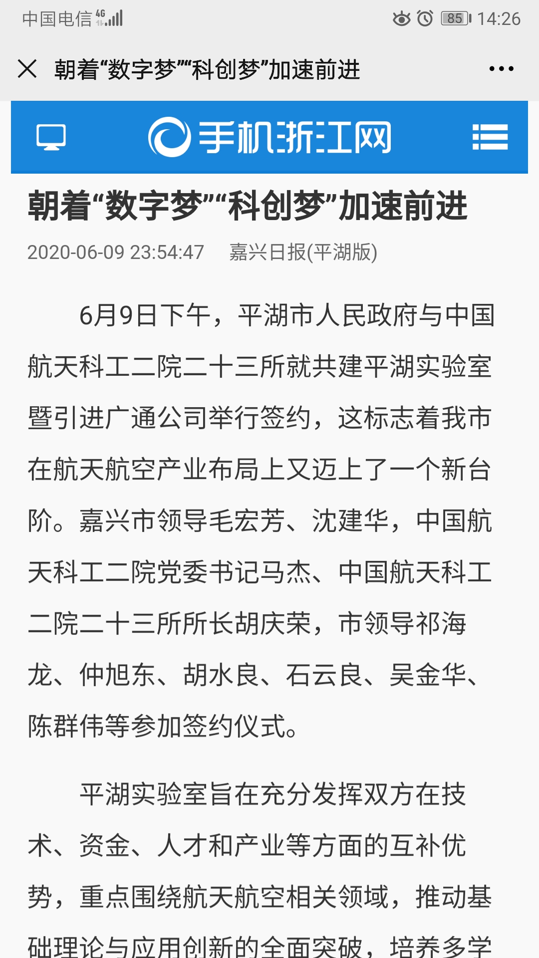 近日,嘉兴日报,浙江省政府网站等报道了23所与平湖市限定平湖实验室建设合作协议一事,双方将以实际行动推进航天科工事业发展。