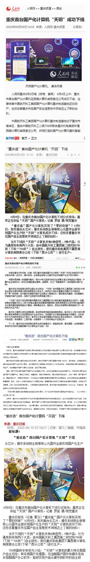 近日,人民网、新华网、中新网、中国工业网、重庆日报等中央级、省部级媒体报道706所“天玥”计算机在重庆正式下线。
