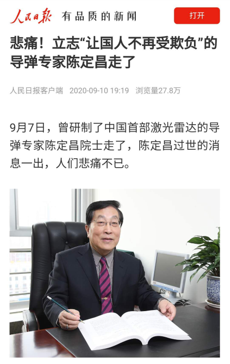 9月7日,曾研制了中国首部激光雷达的导弹专家陈定昌院士走了,陈定昌过世的消息一出,人们悲痛不已。