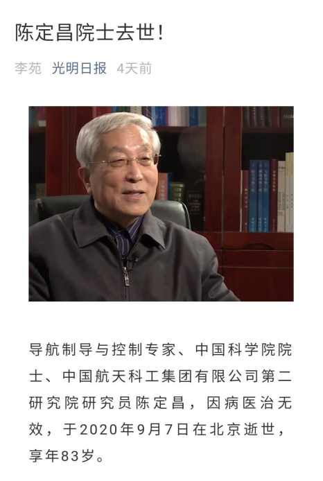 导航制导与控制专家、中国科学院院士、中国航天科工集团有限公司第二研究院研究员陈定昌,因病医治无效,于2020年9月7日在北京逝世,享年83岁。