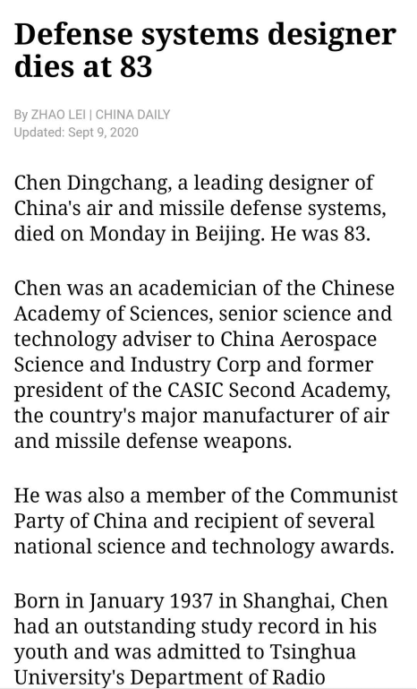 Chen was an academician of the Chinese Academy of Sciences, senior science and technology adviser to China Aerospace Science and Industry Corp and former president of the CASIC Second Academy, the country's major manufacturer of air and missile defense weapons.