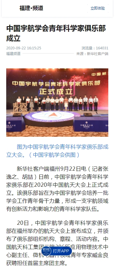 20日,中国宇航学会青年科学家俱乐部在福州举办的航天大会上宣布成立,并颁布了俱乐部组织机构、章程、活动内容。中国航天科工集团二院206所应用物理技术中心副主任、微机电器件领域青年专家臧金良获聘担任首届主席团主席。