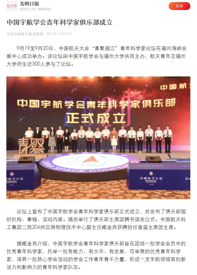 日前,中国宇航学会青年科学家俱乐部在2020年中国航天大会上正式成立。该俱乐部旨在为中国宇航学会培养一批学会工作青年骨干力量,形成一支宇航领域有创新活力和影响力的青年科学家队伍。