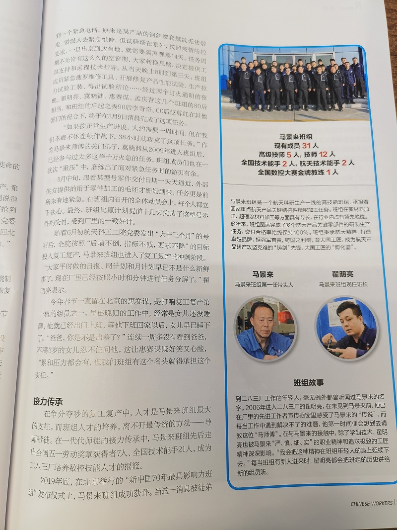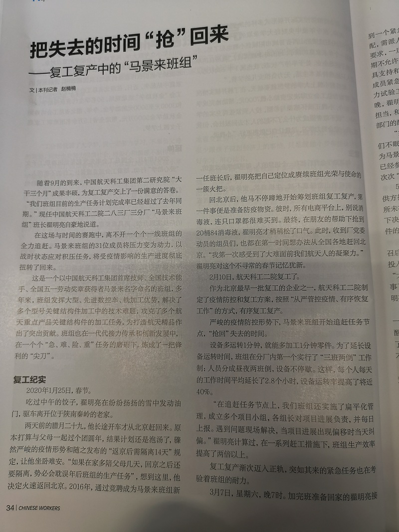 近日,《中国工人》大篇幅报道了二院283厂《把失去的时间“抢”回来——复工复产中的“马景来班组”》。