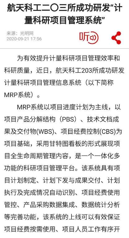 为有效提升计量科研项目管理效率和科研质量,近日,航天科工203所成功研发计量科研项目管理信息系统(以下简称MRP系统)。