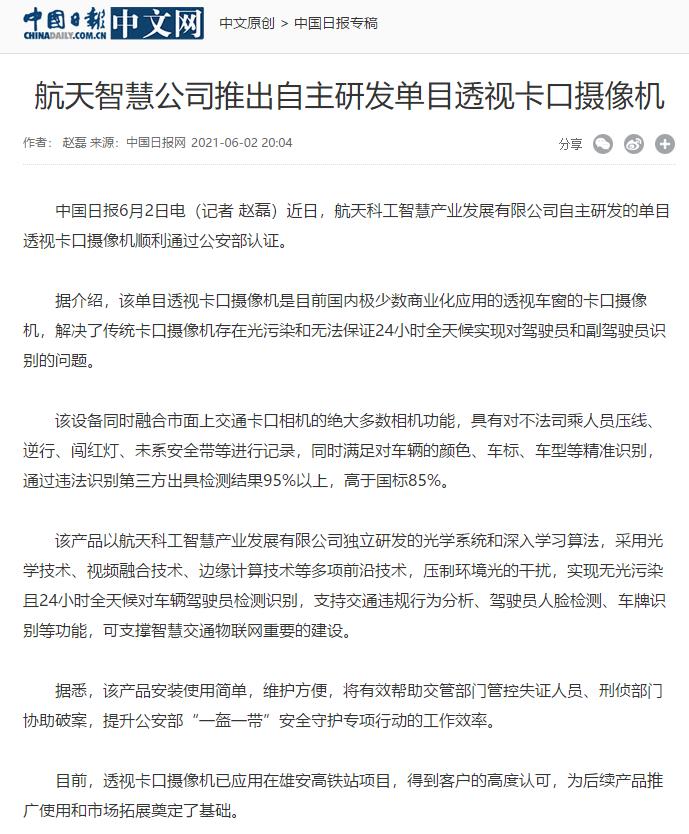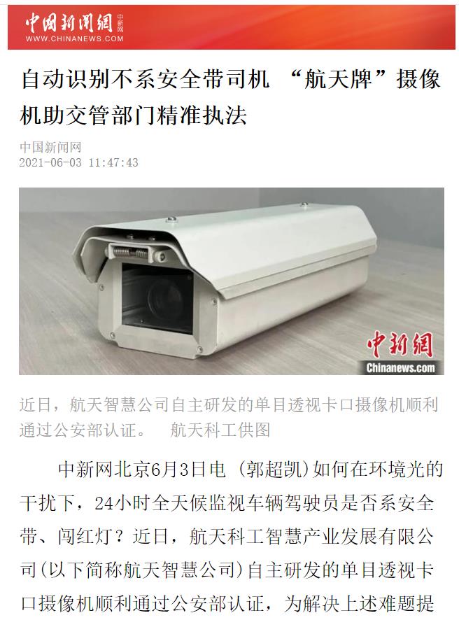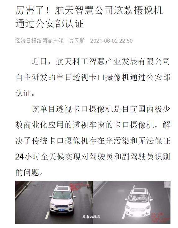 多家媒体报道智慧产业公司自主研发的单目透视卡口摄像机