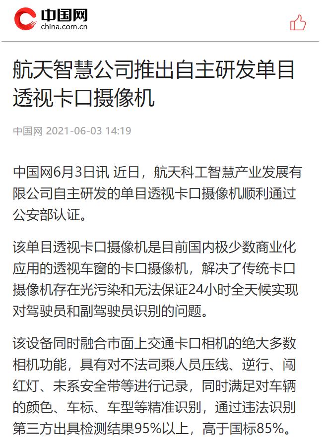 公司自主研发的单目透视卡口摄像机,新浪网、网易、搜狐网、人民网等网站进行了转载,起到了良好的宣传效果。