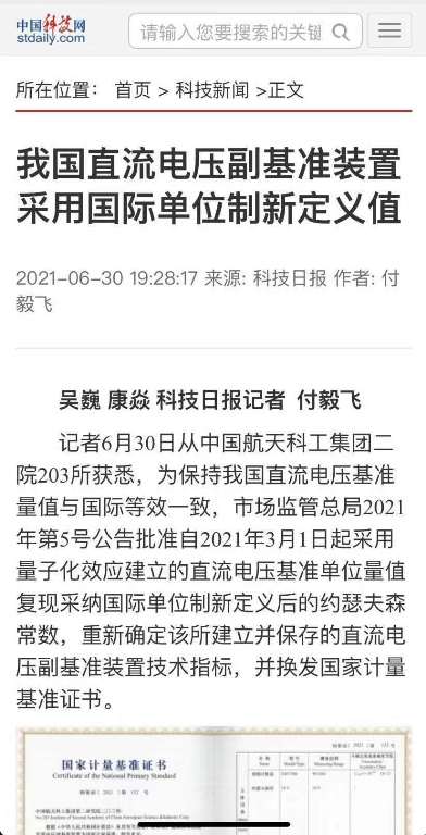 日前,《我国直流电压副基准装置采用国际单位制新定义值》在《中国科技网》刊发,较好地宣传了203所科研生产进展情况,起到了良好的宣传作用。