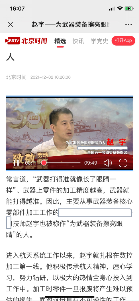 近日,由北京市工业(国防)工会拍摄的“庆建党百年,讲美好故事”劳模工匠系列视频在北京电视台《北京时间》栏目上线播出了。“全国五一劳动奖章获得者”赵宇作为劳模工匠的代表,在视频访谈里分享了他的成长故事和奋进历程