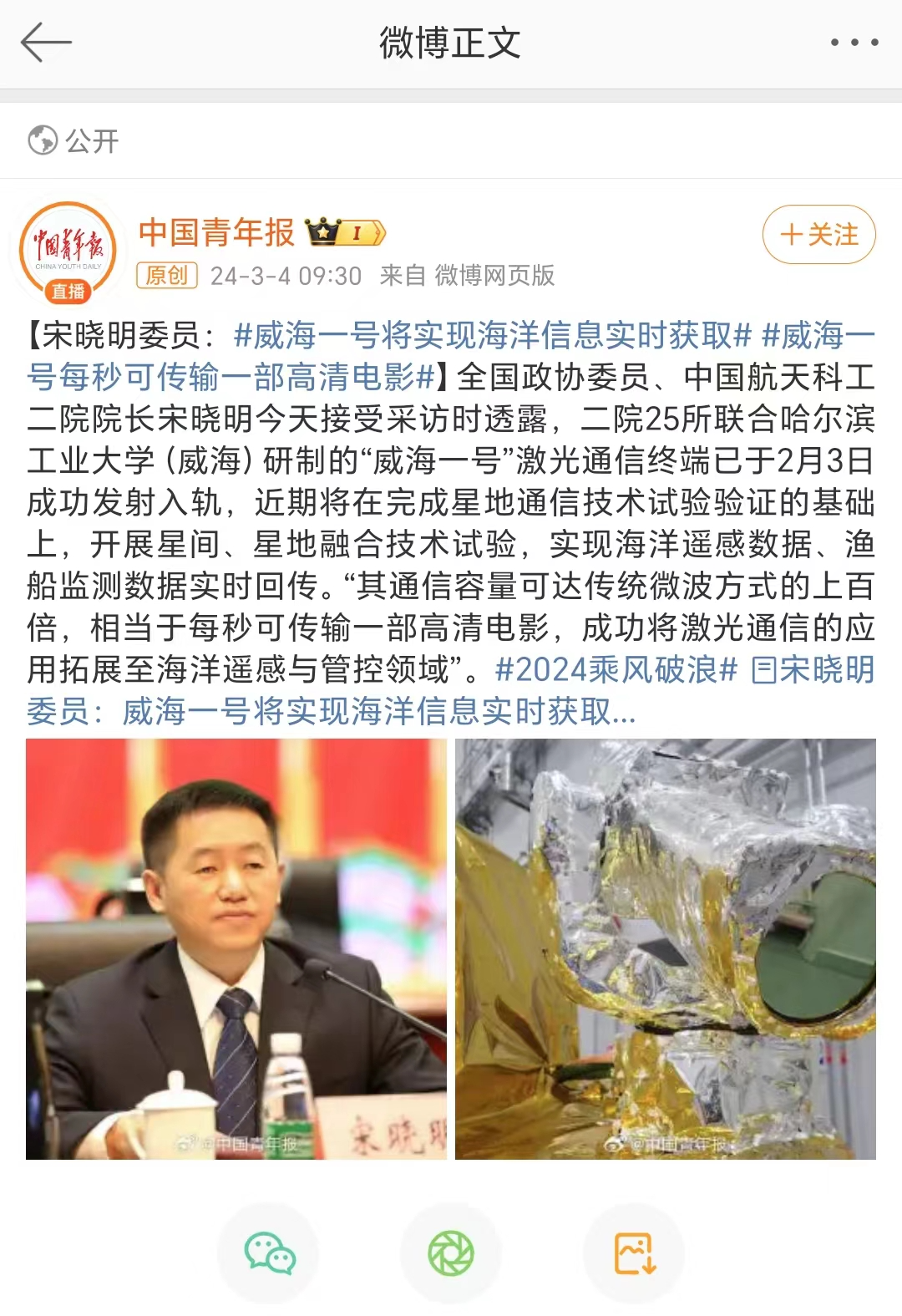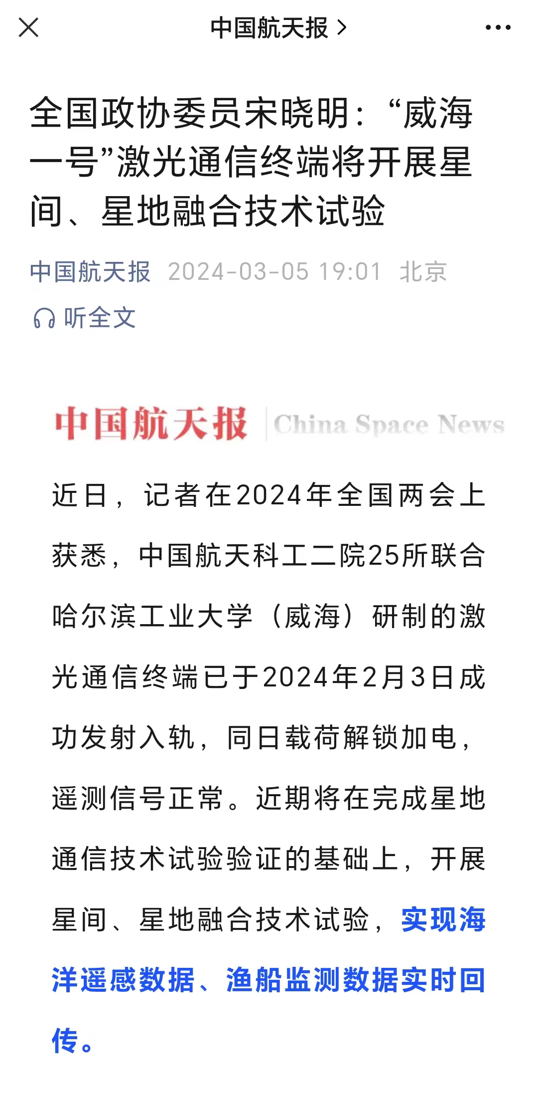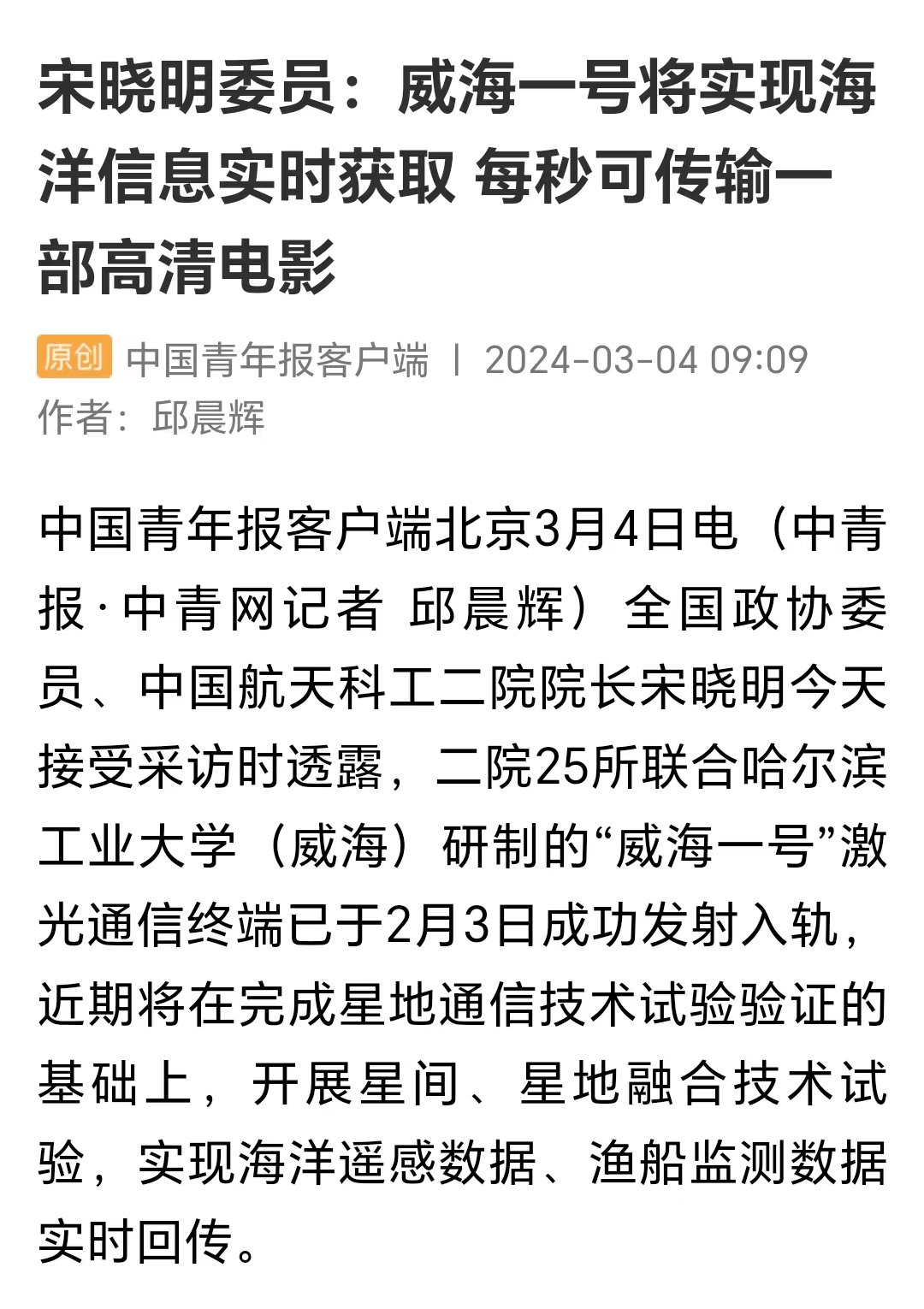 3月4日,全国政协委员、中国航天科工二院院长宋晓明在接受《中国青年报》采访时表示,二院25所联合哈尔滨工业大学(威海)研制的“威海一号”激光通信终端已于2月3日成功发射入轨,近期将在完成星地通信技术试验验证的基础上,开展星间、星地融合技术试验,实现海洋遥感数据、渔船监测数据实时回传。