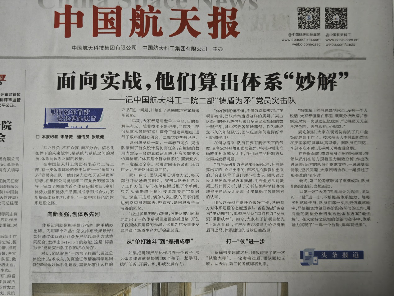 近日,《中国航天报》2024年第160期“履行强军首责 强化使命担当”专栏刊发文章《面向实战,他们算出体系“妙解”》,头版头条报道中国航天科工二院二部“铸盾为矛”党员突击队先进事迹。全文如下: