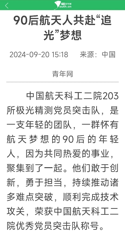 日前,二院203所撰写的题为《极致精准,才能“极光精测”》文章在中青网、国防科工局、《中国航天报》等媒体刊发,介绍了二院优秀党员突击队——极光精测党员突击队的事迹,取得了良好的宣传效果。