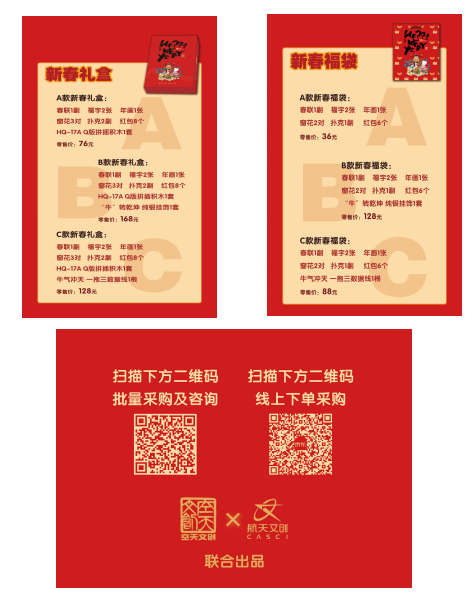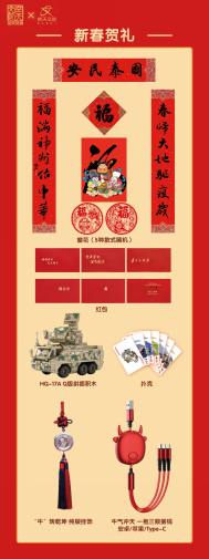 今年的福筒心意满满,有赵宏大师亲笔书写的蜡染宣纸春联、手绘航天卡通年画、福佑中华镂空大红包、高品质植绒窗花、大国重器扑克牌、红旗17拼插积木、牛气冲天三充数据线、“牛”转钱坤纯银挂饰。