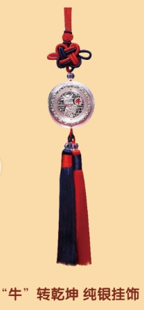 “牛”转钱坤纯银挂饰:一个大大的中国结,串起一对平安喜乐珠,环绕一个扭转乾坤盘,寓意牛年万事如意,“牛”转钱坤,突破逆境,转出好运。