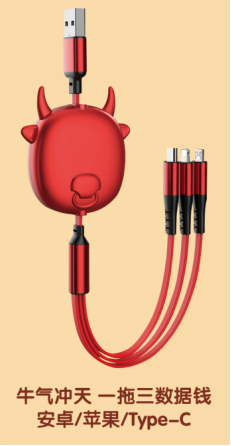 牛气冲天数据线:伸缩自如、小巧便携的三用数据线,兼容市面上各种设备的接口;一秒收纳,五档伸缩,30~12cm随意调节,比传统数据线更容易收纳;升级的3A快充,加粗全铜线芯,提速90%,快速不伤机器。