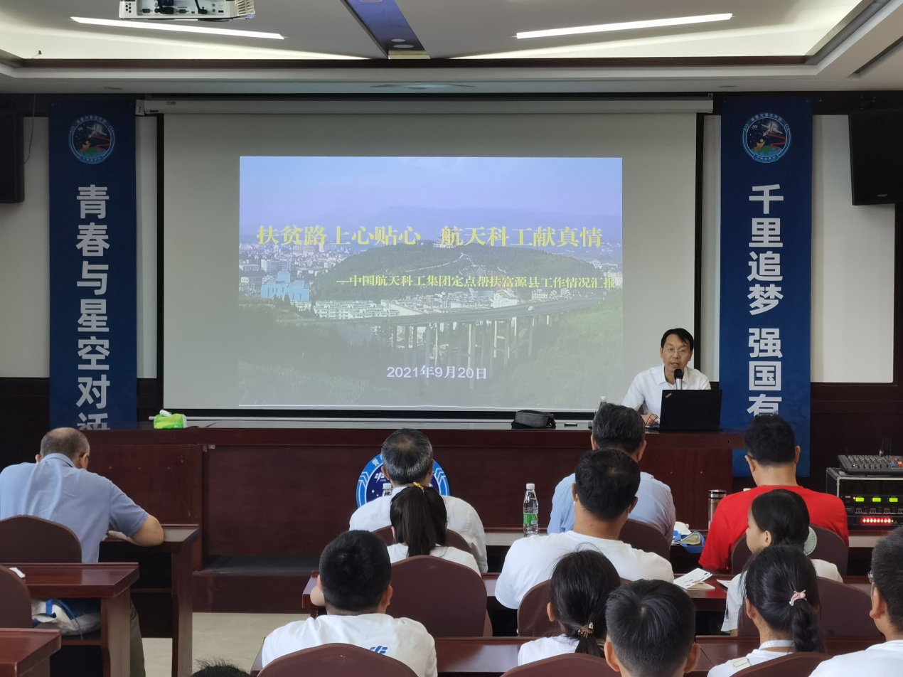 9月20日,在云南富源挂职的扶贫干部王小雷来到天舟三号发射现场参加“青春与星空对话”活动,以“助力乡村振兴 中国航天在行动”为题,为中西部师生代表讲述航天战线助力乡村振兴的故事。带领同学们从科技帮扶、教育帮扶、医疗帮扶、产业帮扶、美丽乡村建设五个方面介绍了航天科工集团形式多样的定点帮扶工作。同学们真切感受到航天扶贫的艰辛历程和丰硕成果。