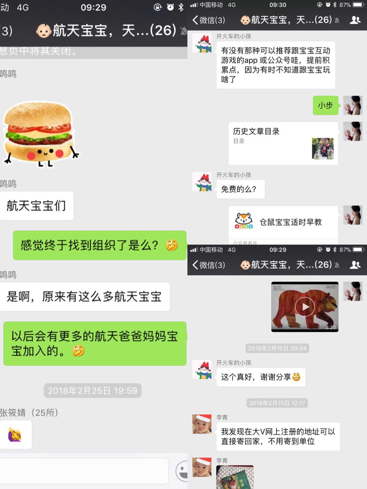 活动通过所内微信群及二院航天宝宝群宣传推广,信息一经发布,很受职工欢迎,不少宝爸宝妈咨询报名,认为这是送给自家孩子最好的新年礼物,还有些同事为摒弃老套的压岁钱模式,将阅读礼包作为送给至亲好友孩子的新年成长礼。购买阅读礼包的宝爸宝妈还组建了微信群——“航天宝宝,天天向上”,分享绘本阅读感受和育儿经验。