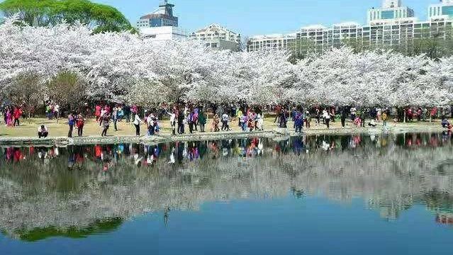 从中堤桥北侧道路再向西,就是闻名遐迩的樱花园了。经过这些年园林工艺师的不懈努力,各种品种的樱花应有尽有,早中晚樱次第开放。这里的樱花漂亮程度举世无双,红色的樱花红过牡丹,白色的樱花白过棉花。每年的樱花节,这里既是花的海洋,更是人的海洋。游人比肩接踵,水泄不通。各种相机、手机噼噼啪啪照个不停,观樱游客收获的是满满的兴奋与幸福感。