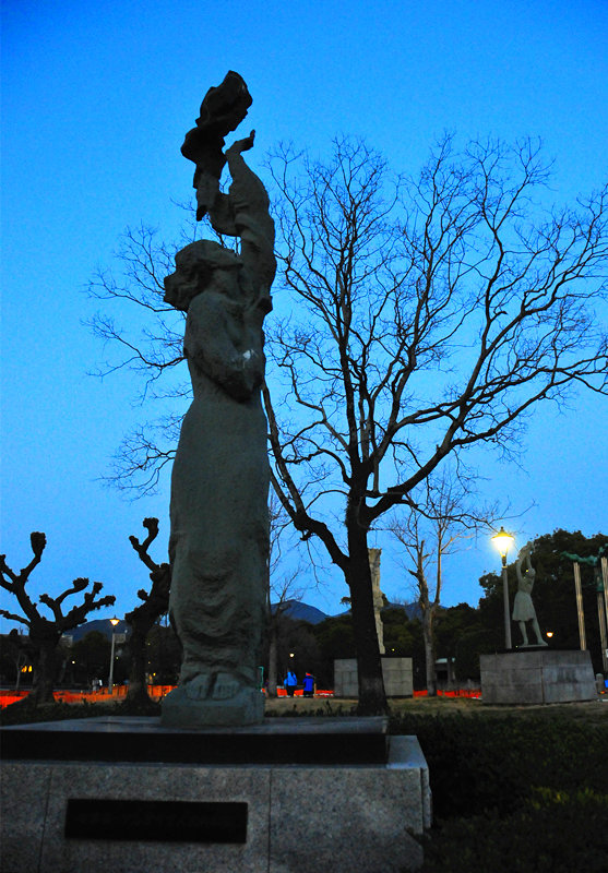 和平之泉里摆放着世界各国的象征和平的纪念品。当然最吸引我眼球的是由时任胡耀邦主席题字“和平”、专船从中国运送到日本长崎的《和平少女》石像,这与那矗立于北京复兴门立交桥处《和平少女》一模一样。